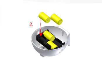 Use D-size batteries 4 x 1.5 volt (alkaline batteries will be more durable). Place in the battery compartment, placing the polarity as shown in the bottom of the battery tray.